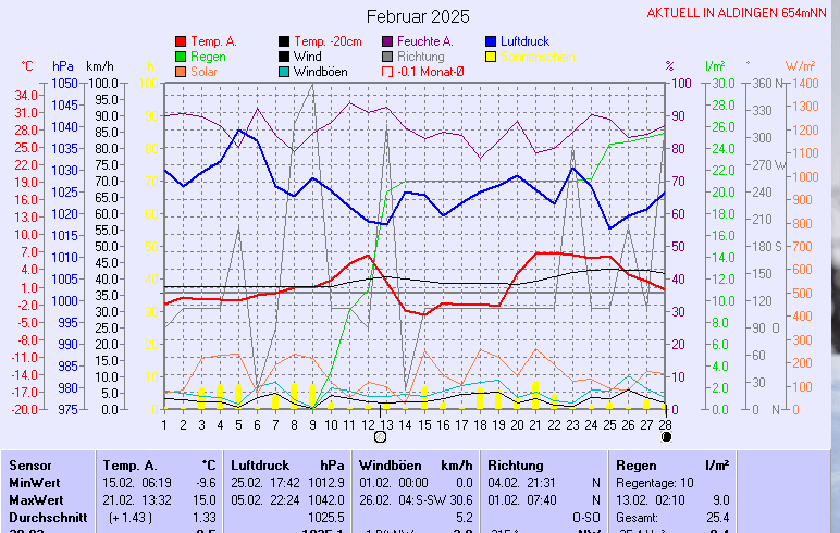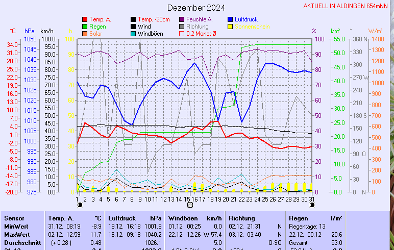 Darstellung des aktuellen und zurückliegenden Wetterverlaufs seit Jan 2002 anhand von Diagrammen und Tabellen |